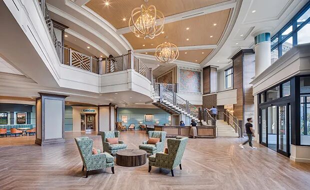 門診南側入口設計兩層通高大廳,使用了同酒店和水療中心的暖色調,營造出溫馨舒適的環(huán)境。